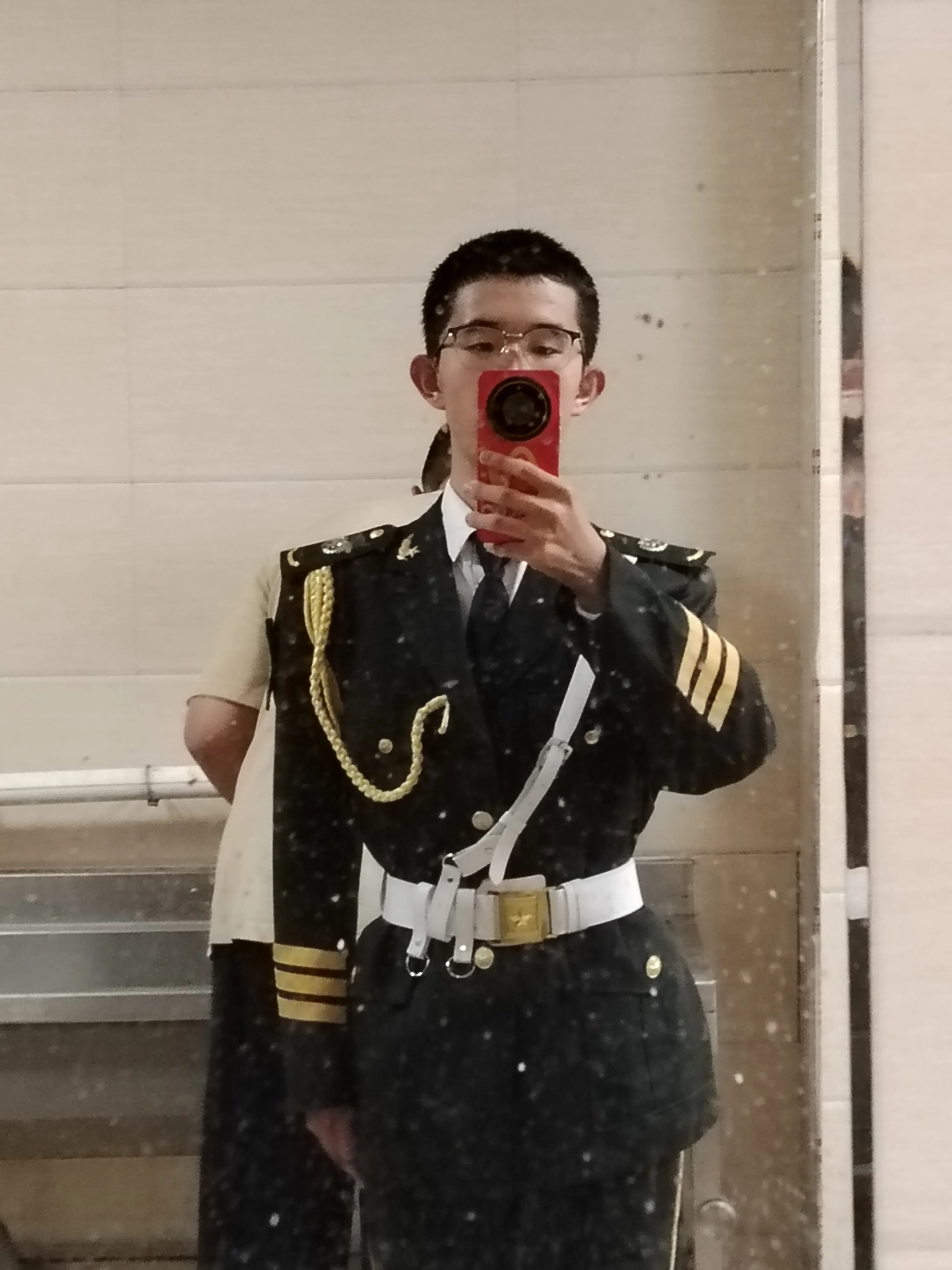第一次正式升旗,虽然训练了一年,但是真正上场的时候还是忍不住的紧张。我已经忘记了前一个晚上我是怎么入睡的了,只记得当晚没睡了几个小时,满脑子都是第二天的升旗,但是最后还不错,那也是我最满意的一次。虽然在国护没能有一个好的结束,但是我很满意了,我坚持到了最后,也没什么难的,没有什么遗憾,我证明了我的体能很好,我长跑很不错,我高强度坚持锻炼了整整一年半,这便是最大的收获了。